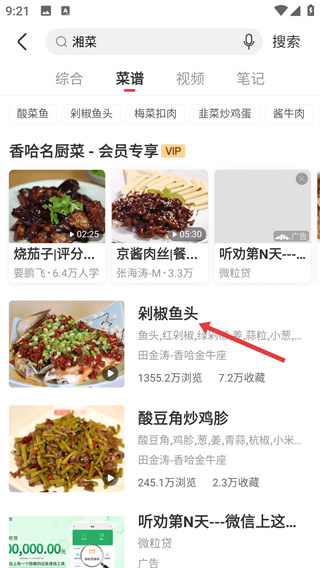 3、进入【湘菜】菜谱列表页,可选对应的菜品,查看其浏览、收藏数据,挑选高热度菜谱查看详情。
