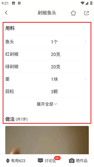 4、进入【剁椒鱼头】详情页,查看【用料】明细,点击【展开全部】看完整用料,再查看【做法】学制作步骤。