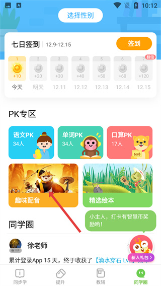 1、进入“同学圈”页面后,找到PK专区中的【趣味配音】选项,点击进入配音功能页面。