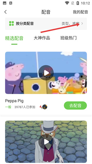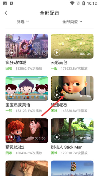 2、在配音页面,点击“类型、难度”区域,进入全部配音的分类列表页面。