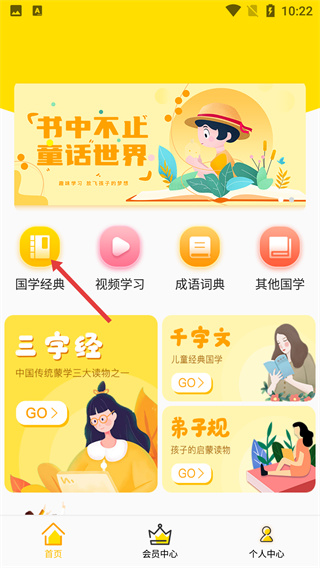 1、进入首页后,点击【国学经典】选项,进入国学经典的分类学习页面。
