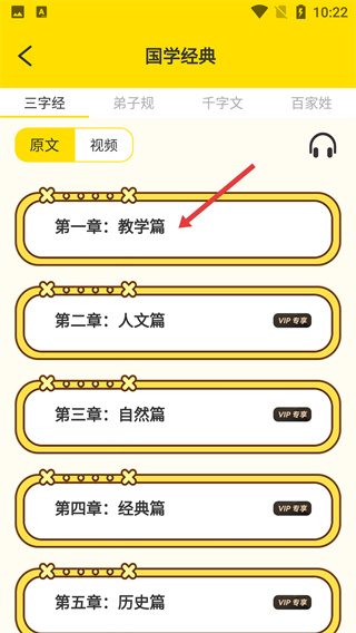2、在国学经典页面,选择“三字经”板块下的【第一章:教学篇】,进入该章节的详情页面。