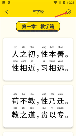 3、在三字经详情页,点击右上角的播放按钮,启动该章节内容的学习播放。