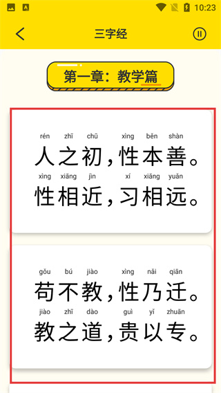 4、播放启动后,即可跟随展示的内容,学习三字经第一章的原文内容。