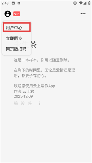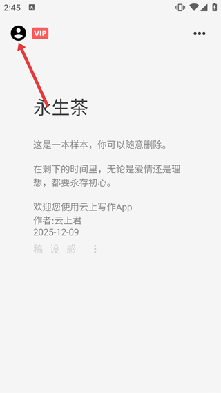 1、在【永生茶】的样本操作页面中,点击左上角带有【VIP】标识的用户头像,弹出功能操作的菜单栏选项列表。