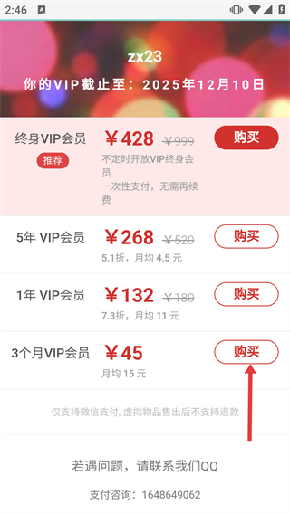 4、在VIP购买页面选择对应时长的套餐,点击【购买】按钮开通,仅支持【微信支付】且虚拟物品不做退款处理。