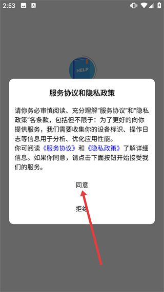 1、在弹出的【服务协议和隐私政策】弹窗中,阅读【服务协议】与【隐私政策】后,点击【同意】按钮以进入软件后续界面。