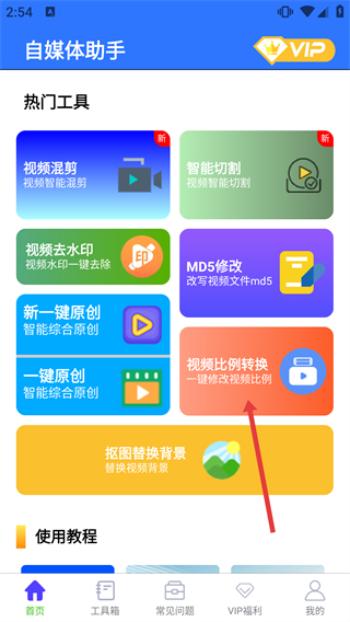 2、在【自媒体助手】的首页热门工具区域,找到【视频比例转换】功能选项,点击进入其操作页面。