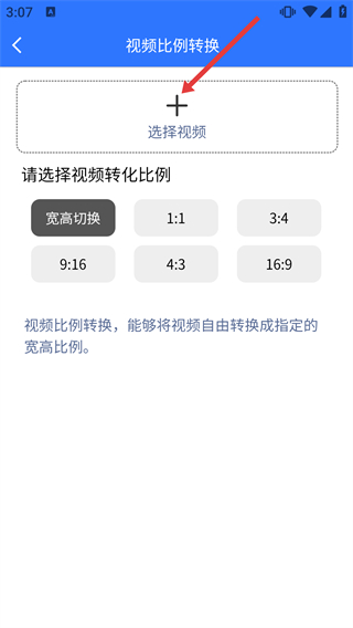 3、进入【视频比例转换】页面后,先点击【选择视频】按钮选取需处理的视频素材,再选择对应比例选项。