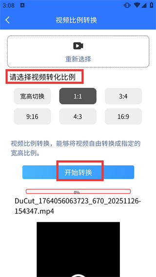 4、选好视频素材并选定【1:1】等比例后,点击【开始转换】按钮,启动视频比例的转换流程。