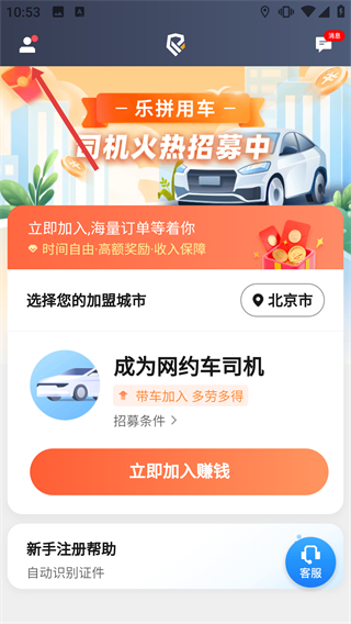 1、在乐拼用车的司机招募页面,点击左上角的个人图标,进入司机个人中心页面,可查看钱包、模拟接单等功能。