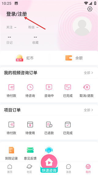 1、在“我的”页面,点击“登录/注册”选项,进入账号的登录或注册界面,为使用应用功能做准备。