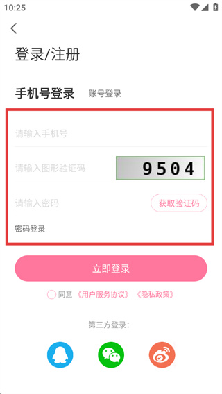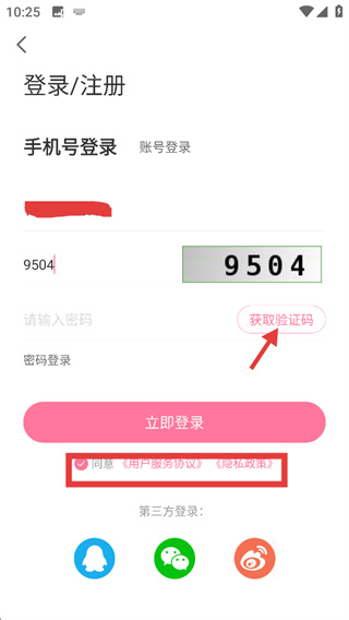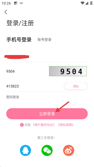 4、在输入框填写收到的短信验证码后,点击“立即登录”按钮,完成账号的注册登录操作。