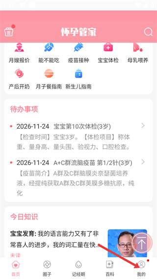1、在“怀孕管家”首页,点击底部“我的”按钮,进入个人中心页面,可开展宝宝信息等相关管理操作。