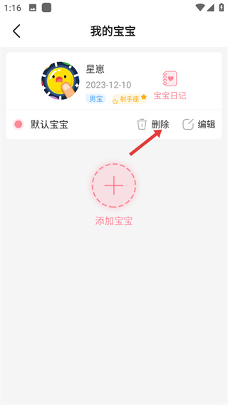 3、在“我的宝宝”页面,点击目标宝宝对应的“删除”按钮,弹出删除确认弹窗,准备移除该宝宝信息。