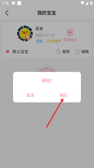 4、在删除确认弹窗中,点击“确定”按钮,完成该宝宝信息的删除操作。