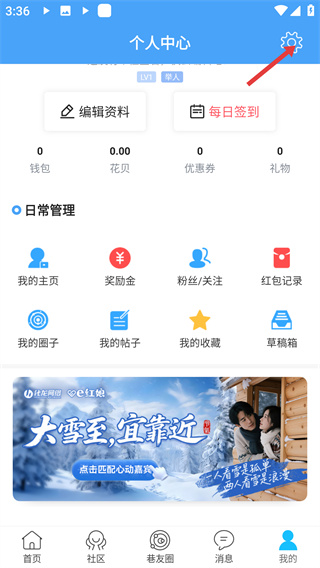 1、进入【个人中心】页面,点击右上角的【设置】按钮,进入应用的设置配置页面。