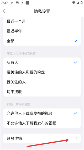 3、在【隐私设置】页面底部,选择【账号注销】选项,进入账号注销的确认页面。