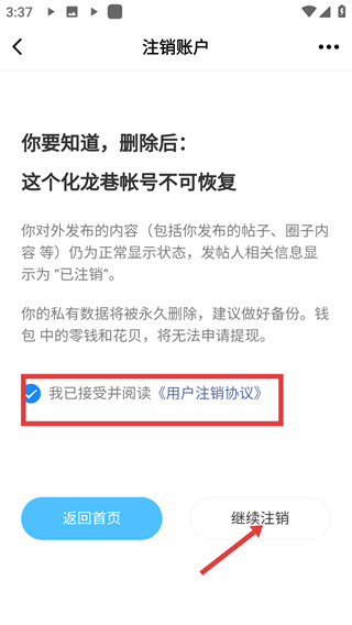 4、在【注销账户】页面,勾选【我已接受并阅读《用户注销协议》】,再点击【继续注销】按钮,推进账号注销流程。