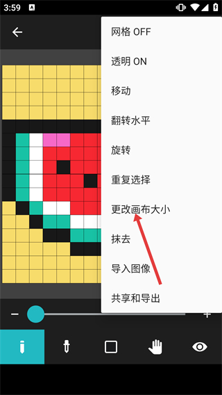 1、支持多种画布尺寸调整,96色调色板+24种自定义调色板,满足从简约到复杂的像素构图需求。