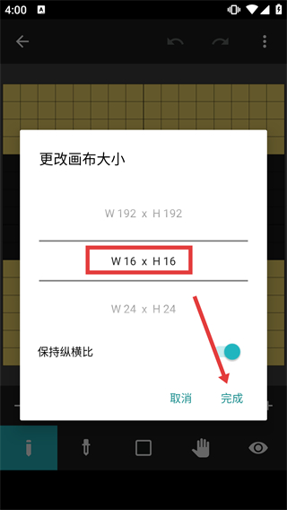 4、在更改画布大小的弹窗中,选择目标尺寸(如W16×H16)后,点击“完成”按钮,确认并应用画布尺寸的修改。