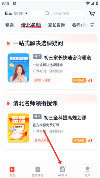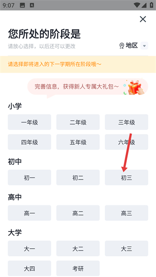 1、在学习阶段选择页面,选择“初中”分类下的“初三”选项,完成学习阶段的设置,进入对应学段的功能页面。