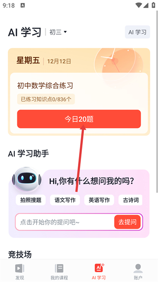 3、在学习页面,点击“今日20题”按钮,进入初中数学综合练习的答题界面,开始当日的习题练习。
