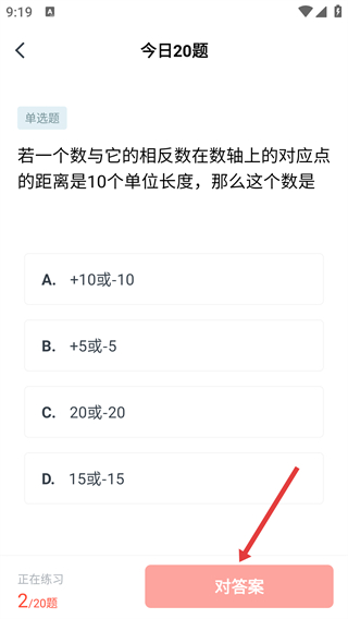 4、在“今日20题”的答题页面,完成题目作答后,点击“对答案”按钮,查看题目对应的正确答案及解析。