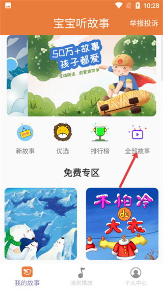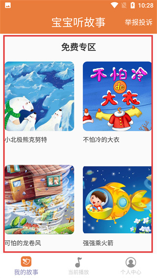 1、在【宝宝听故事】的【免费专区】页面,可查看【小北极熊克努特】、【不怕冷的大衣】等故事,点击对应条目进入相关页面。
