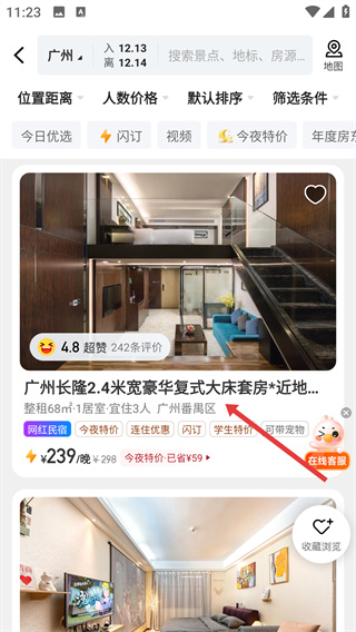 2、进入民宿列表页,可查看各种房源、评分和价格,点击房源条目进入详情页。