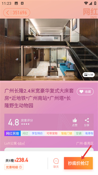 3、在民宿详情页,确认房型、评分等信息后,点击底部【抄底价抢订】按钮,进入订单填写页面。