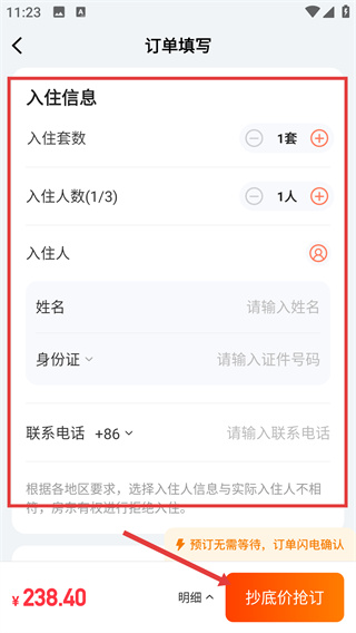 4、在订单填写页,完善【入住人数】、【姓名】、【身份证】等信息后,点击【抄底价抢订】按钮提交预订。