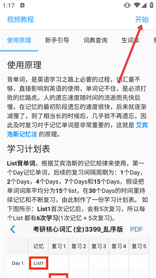 1、在【视频教程】页查看【使用原理】,了解背单词依托【艾宾浩斯记忆法】的逻辑,点击右上角【开始】进入后续操作。