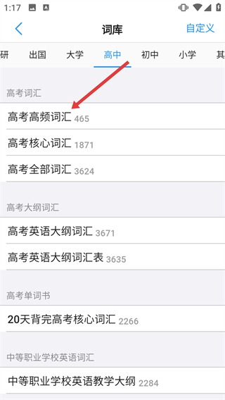 2、进入【词库】页选择【高中】分类,找到【高考高频词汇-465】词库,可按需挑选对应的词汇学习资源。