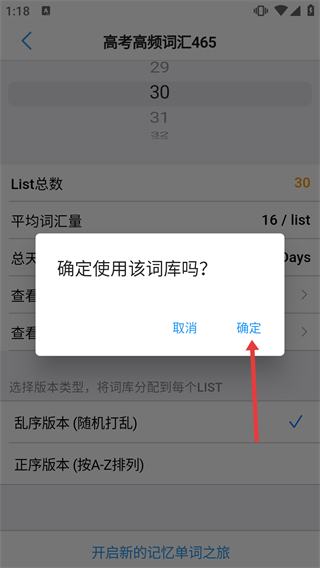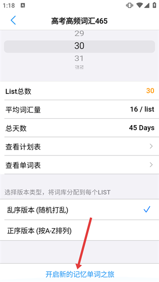 3、在【高考高频词汇465】页查看【List总数-30】等信息,选定版本后点击【开启新的记忆单词之旅】启动学习。