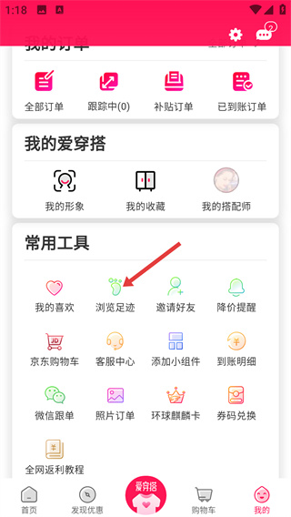 2、进入“我的”页面后,在常用工具区域点击“浏览足迹”选项,进入浏览过的宝贝记录页面。