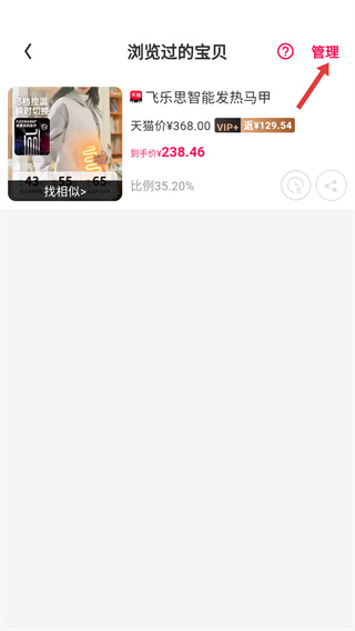 3、在浏览过的宝贝页面,点击右上角“管理”按钮,进入浏览足迹的管理操作模式。