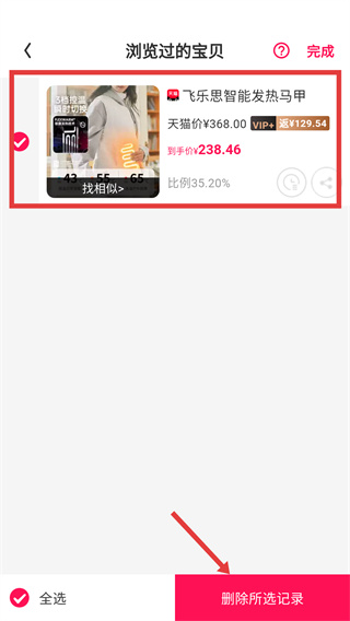 4、在管理模式下勾选目标浏览记录,点击底部“删除所选记录”按钮,完成对应浏览足迹的删除操作。