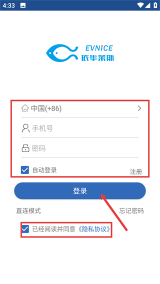 1、在【依华莱斯-EVNICE】登录页,选择【中国(+86)】,填写【手机号】与【密码】,勾选同意【《隐私协议》】后点击【登录】按钮完成账号登录。