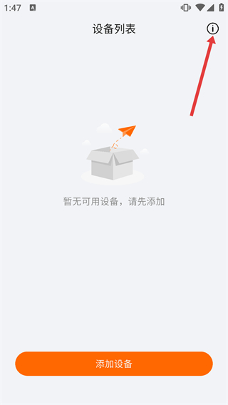 2、在设备列表页面,点击右上角信息图标进入应用信息页,当前暂无设备,后续可通过【添加设备】按钮添加。