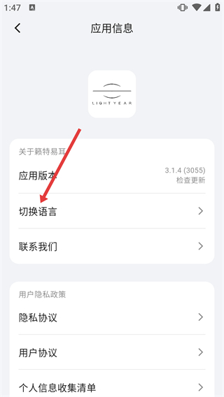 3、在应用信息页面,找到【切换语言】选项并点击,即可打开语言选择弹窗,进行应用显示语言设置。