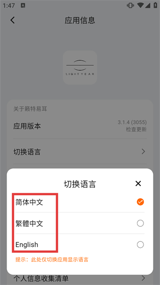 4、在切换语言弹窗中,可选【简体中文】【繁體中文】【English】,选定后完成应用显示语言的切换。