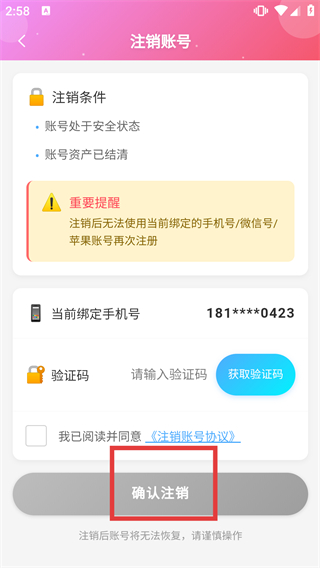 4、在【注销账号】页,确认账号满足安全-资产结清条件,填验证码并同意协议,点击【确认注销】完成账号注销。
