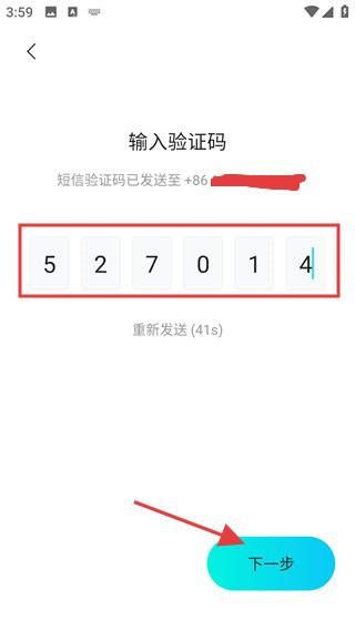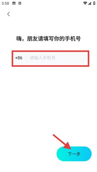2、在【+86-请输入手机号】的输入框中填写对应号码,确认内容准确后,点击界面的【下一步】按钮推进操作。