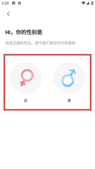 4、在【HI-你的性别是】界面选择【女】或【男】的选项,完成性别选择,进入下一步完善信息。