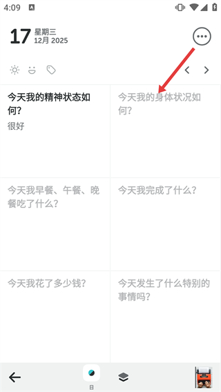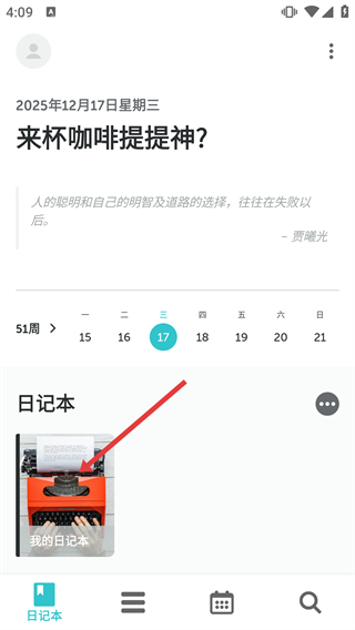 1、在显示【2025年12月17日】的界面中,找到【日记本】板块右侧的【三点按钮】并点击,可触发更多操作的选项菜单。