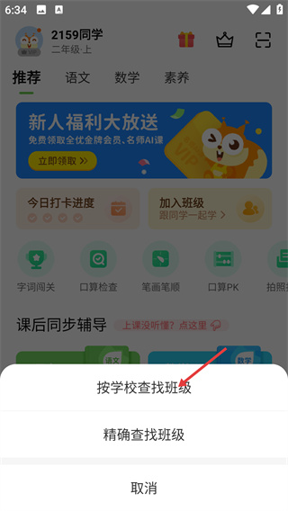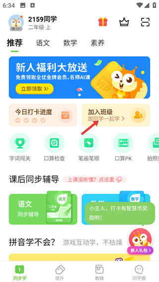 1、在二年级上的“同步学”主界面,点击“加入班级”模块,该功能用于加入班级同步学习、接收老师布置的作业。