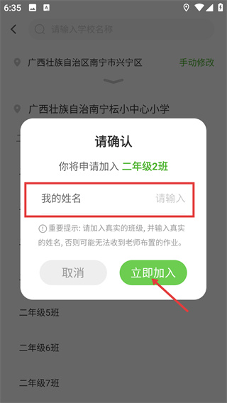 4、选定具体班级后,在“请确认”弹窗中填写“我的姓名”,点击“立即加入”按钮,完成班级的申请操作。