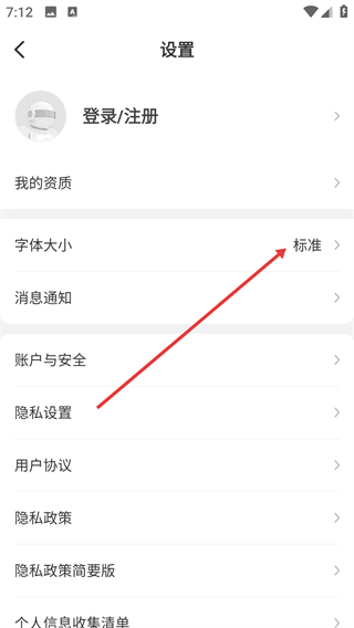 3、在设置页面中找到【字体大小】选项,其当前状态为【标准】,点击该选项,进入字体大小的具体设置界面。