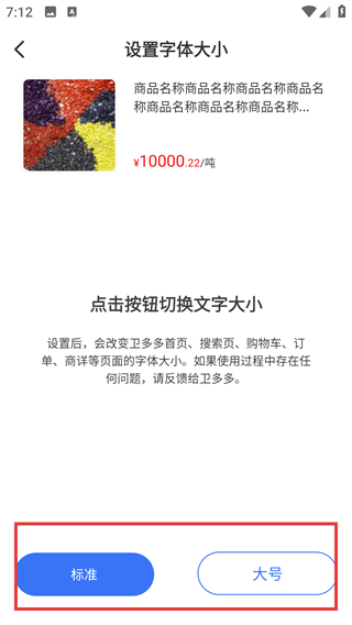 4、进入【设置字体大小】页面,可看到【标准】【大号】两个按钮,点击【大号】即可切换字体,该设置会同步到首页、商详等页面。